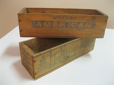 Title (ebay affiliate link): TWO VINTAGE WOODEN CHEESE BOXES, MEL O BIT AND TASTY LOAF, AMERICAN CHEESE