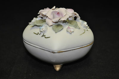 Title (ebay affiliate link): VINTAGE LEFTON #1268 FLOWERED TRINKET BOX HEART SHAPED PINK ROSES GOLD TRIM