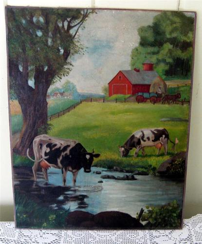 Title (ebay affiliate link): Antique Primitive Oil on Board Farm Scene-Cows at the Water's Edge