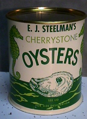 PT E J STEELMANS CHERRYSTONE OYSTERS TIN OYSTER CAN CHERITON VA WITH SEA HORSE