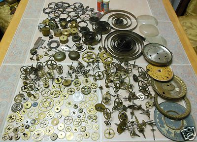 Title (ebay affiliate link): ANTIQUE & VINTAGE CLOCK PARTS Huge Lot Gears Mainsprings Chimes Seth Thomas Face