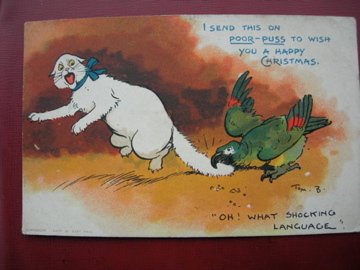 TOM BROWNE SCARCE XMAS OVERPRINT COMIC POSTCARD PARROT & CAT