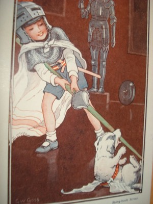 Title (ebay affiliate link): G. W. GOSS Greeting postcard COMIC Boy In ARMOR Playing with dog Lance Helmet