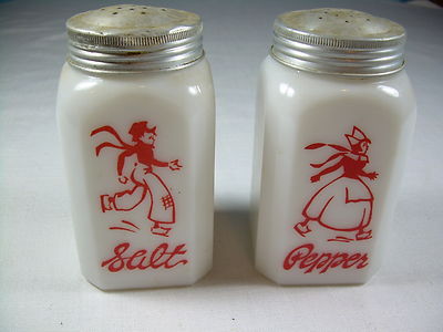 Title (ebay affiliate link): Vintage White Milk Glass Dutch Figures Salt & Pepper Shakers with Aluminum Lids