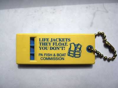 Title (ebay affiliate link): PA FISH COMMISSION WHISTLE KEY CHAIN "LIFE JACKETS THEY FLOAT. YOU DON'T!"