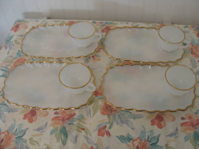 MILK GLASS 4 GOLD TRIM LUNCHEON PLATES AND CUPS EUC