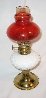 Vtg 9" kerosene lamp red globe milk glass diamond base
