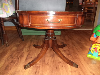 Title (ebay affiliate link): VINTAGE DUNCAN PHYFE ROUND SIDE LAMP/DRUM TABLE-LEATHER TOP/GOLD LEAF ACCENT