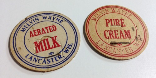 Title (ebay affiliate link): 2 Vintage Melvin Wayne Lancaster Wisconsin Glass Milk Bottle Cap Pog Inserts