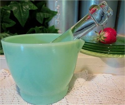 JADITE~ JADEITE JADE Green MILK GLASS MORTAR BOWL & CRYSTAL PESTLE