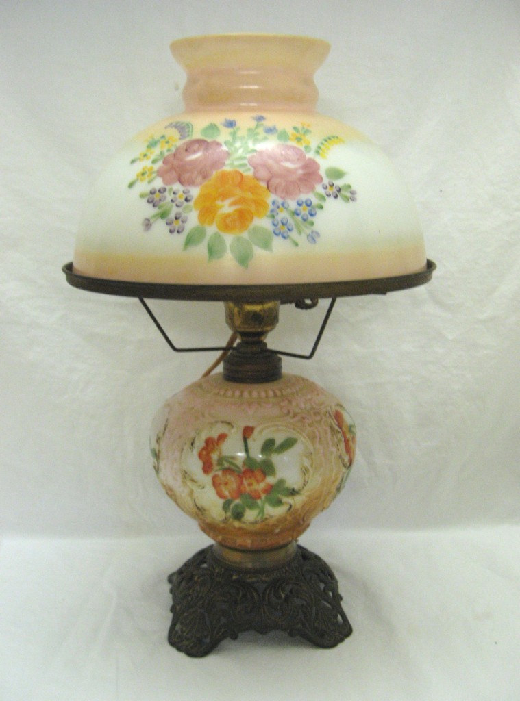 Antique MILK GLASS Lamp With Handpainted Floral Shade