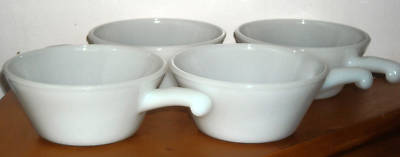 FIRE KING WHITE MILK GLASS FOUR SOUP HANDLE BOWLS. USA