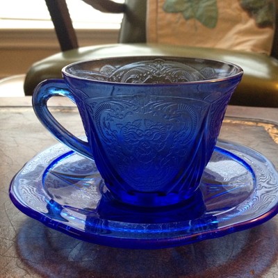 Title (ebay affiliate link): Hazel Atlas Cobalt Blue Royal Lace Tea Cup And Saucer 1930's Depression Glass