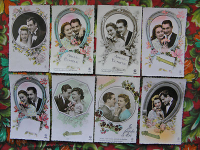 8 1940s Deco Romantic Lady Couple Portrait Bride Horse Shoe Photo Post Cards