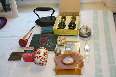 Title (ebay affiliate link): Vintage Junk Drawer Lot--Antique Iron-Clock-Oil Lamps-Tobacco Tins-Porcelain Egg