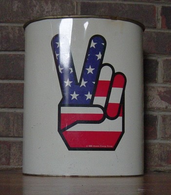Title (ebay affiliate link): V VICTORY PEACE SIGN AMERICAN FLAG USA VINTAGE METAL TRASH CAN 1969 THINK GREEN