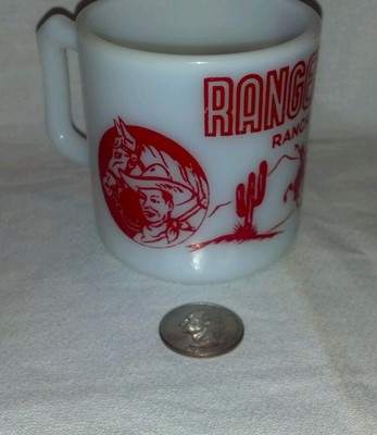 Title (ebay affiliate link): Hazel Atlas Kiddie Ware Ranger Joe Ranch Milk Glass Mug Vintage Red Lettering 3"