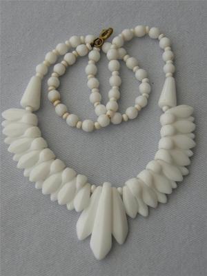 Pretty Vintage Egyptian Revival White Milk Glass Cleopatra Fringe Necklace