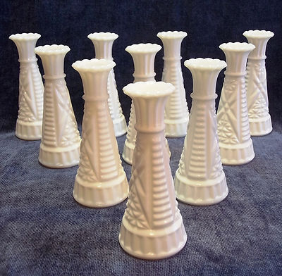 Title (ebay affiliate link): Lot of 10 Vintage Anchor Hocking Milk Glass Stars & Bars Pattern 6" Bud Vases