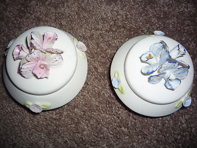 Vintage Capodimonte Covered Trinket Boxes Blue and Pink Flowers