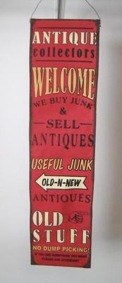 Title (ebay affiliate link): Long Hanging Painted Primitive Canvas Sign "We Buy Junk & Sell Antiques"