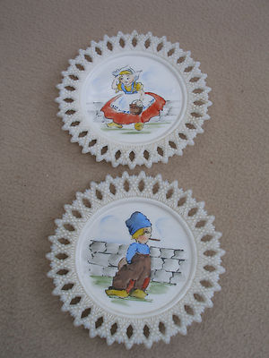 Wonderful Pair Of Vintage 6" Hand Painted Dutch Boy & Girl Milk Glass Plates
