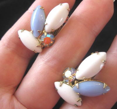 Title (ebay affiliate link): VINTAGE PERIWINKLE & WHITE MILK GLASS CABS W/ AB RHINESTONES EARRINGS. ESTATE