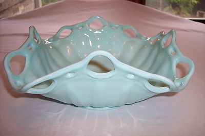 Turquoise Blue Milk Glass Open Lace Ruffled Edge Bowl