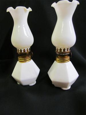 PAIR VINTAGE MINIATURE MILK GLASS OIL LAMPS