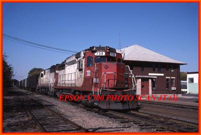 WC/SOO-708 (3) GP30 Orig RR Slide Stevens Point Wi.1989 Train Scene @ Depot