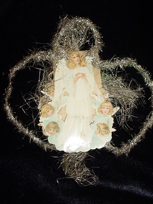 Title (ebay affiliate link): ANTIQUE VICTORIAN CHRISTMAS SCRAP & TINSEL ORNAMENT DIECUT ANGEL & LITTLE ANGELS