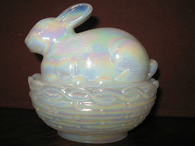 White Milk carnival glass bunny rabbit on nest basket dish easter egg iridescent