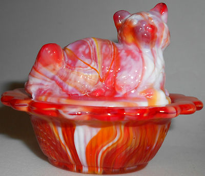 Ruby Red & milk slag glass salt cellar celt cat kitten kitty on nest basket dish