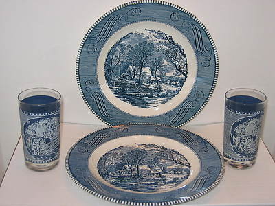 4 Royal China CURRIER and IVES 2 Dinner Plates & 2 Milk Blue White Glasses !