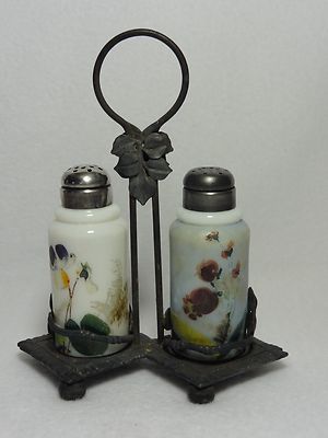 Antique Milkglass Salt & Pepper Shakers HandPainted hartford silverplated holder
