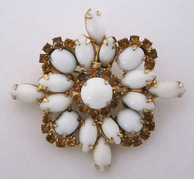 Vintage Topaz Rhinestone/Milk Glass Cabochon Brooch