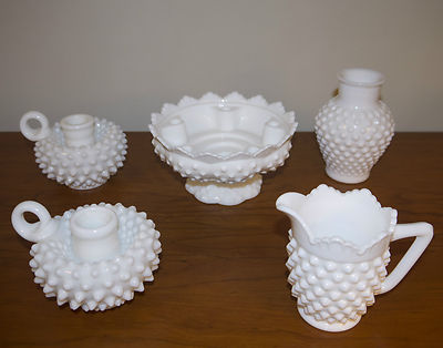 Title (ebay affiliate link): FENTON MILK GLASS HOBNAIL 5 PIECE LOT VASE CENTER PIECE CANDLE HOLDER CREAMER