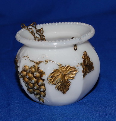 ANTIQUE OPAQUE WHITE MILK GLASS BURNT MATCH HOLDER GRAPE CLUSTERS LEAVES CHAIN