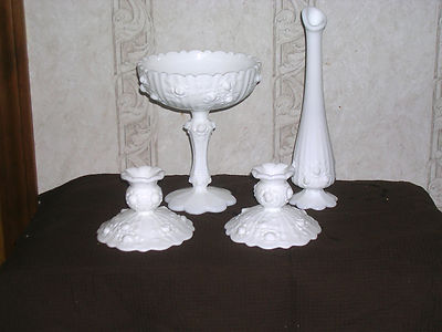 Title (ebay affiliate link): VTG FENTON MILK GLASS ROSE CABBAGE ROSE COMPOTE CANDLE HOLDERS STRETCH VASE