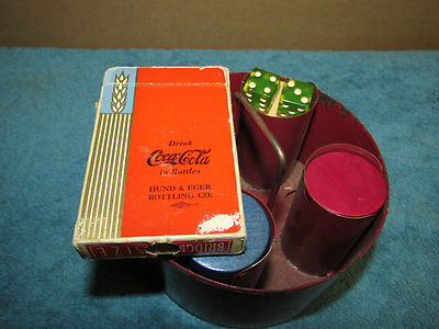 Title (ebay affiliate link): ANTIQUE RARE COCA COLA POKER SET W/ HUND & EGER REMEMBRANCE CARDS CHIPS DICE