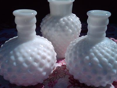 Title (ebay affiliate link): FENTON MILK GLASS HOBNAIL WHITE CANDLE HOLDERS Globe and SMALL VASE ART GLASS