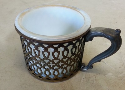 ANTIQUE VERY RARE SHAVING MUG BRASS MUSTACHE CUP HOMAN 3718 MILK GLASS INSERT