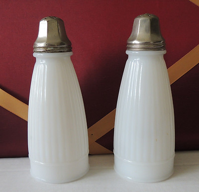 Title (ebay affiliate link): Vintage Ribbed Milkglass Tall Salt and Pepper Shakers Metal Screw Caps
