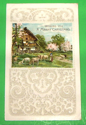 Title (ebay affiliate link): CHRISTMAS ~~ "Lace-look" surrounds Sheep ~~ Farm scene ~~ embossed postcard