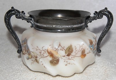 Title (ebay affiliate link): Antique Milk Glass Marmalade Jelly Jar Vase with Silverplate Top with Handles