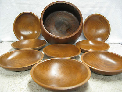 Title (ebay affiliate link): VINTAGE SALAD BOWL & 8 WOODCRAFTERY AMERICAN HAND TURNED WOODENWARE 9 PIECE SET