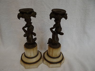 antique marble & bronze cupid figural candlesticks 19th c French 10.5" tall