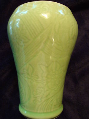 Title (ebay affiliate link): Beautiful Antique Vintage Green Ceramic Pottery Vase with Inlaid Flowers