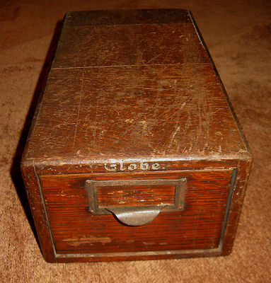 Title (ebay affiliate link): ANTIQUE GLOBE TIGER OAK DESK TOP SINGLE DRAWER CARD ~RECIPE FILE BOX