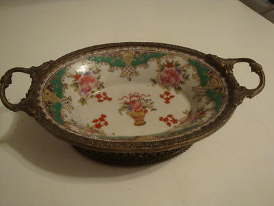 Title (ebay affiliate link): Stunning Asian small oval footed ceraimc/porcelain and brass floral detail bowl